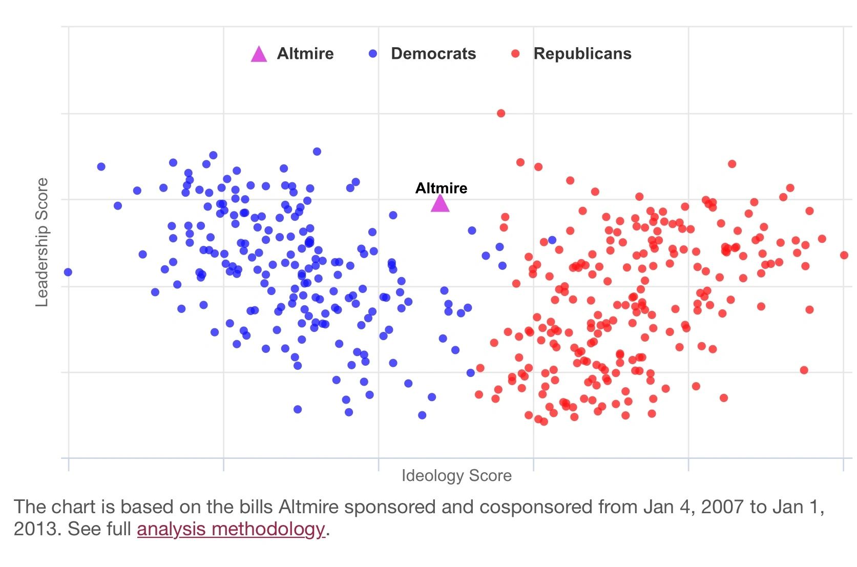 The nonpartisan group GovTrack complies statistical data evaluating Congress and its members. This chart shows Altmire’s Ideology-Leadership rating for his entire tenure in office, compared to the individual Democrats (blue) and Republicans (red) with whom he served.